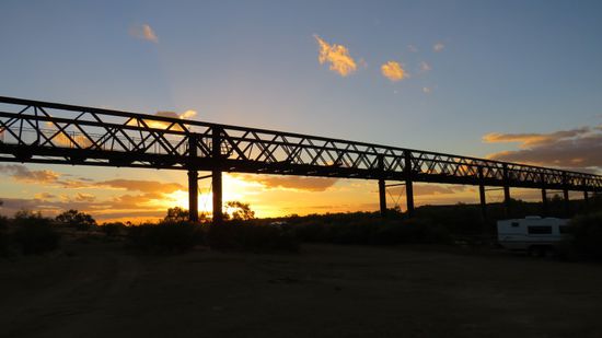 bevor wir dann im Abendsonnenschein den touristischen Höhepunkt des Tages erreichen, die mit 578m längste Eisenbahnbrücke auf dieser Strecke und damit auch die längste von SA, die Algebuckina Rail Bridge.
