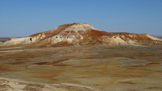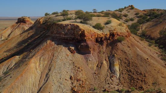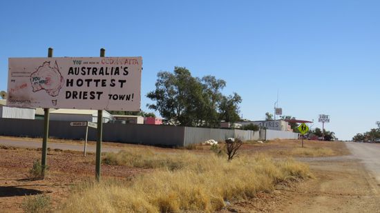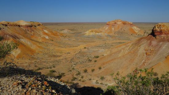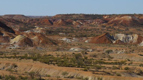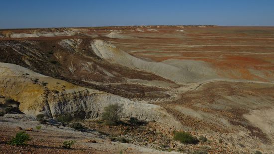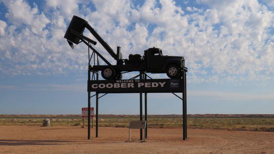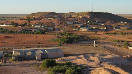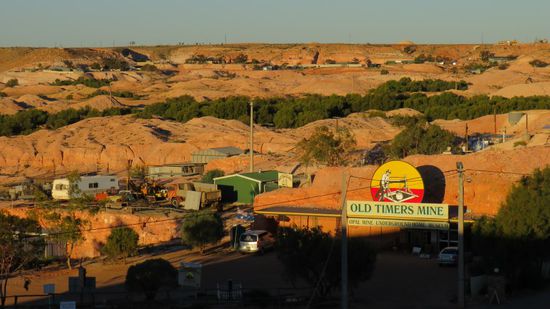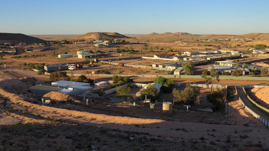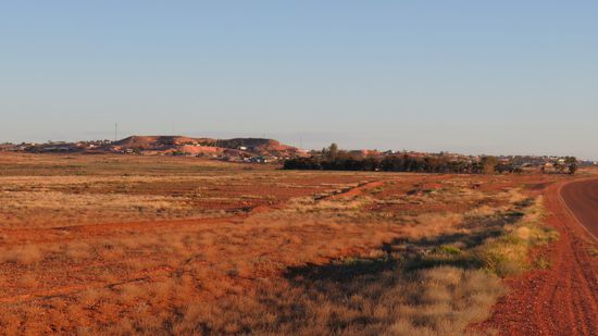 trostlose, baumlose Ebenen, die stark an das Nullabor erinnern. Endlich taucht Coober Pedy mit seinen 3.500 Ew. am Horizont auf,
