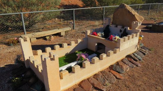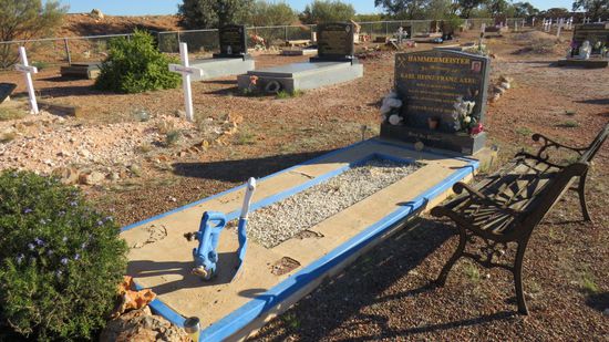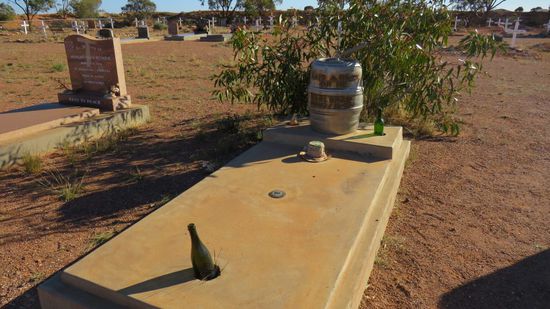 Unsere kühnsten Träume werden wahr, gegenüber des Info Centers entdecken wir eine Telstra Wifi Station, für uns als Kunden bedeutet da unbegrenzter schneller Internet Zugang, wir können endlich unsere Mails lesen, unseren Reisebericht veröffentlichen, fast 4 Stunden lang im Netz verschwinden. Nachdem wir im Info Center erfahren, dass das Breakaways Reserve, Ort meiner 60er Geburtstagsfeier, mittlerweile von den ‚Traditionellen Landeigentümern‘ verwaltet wird – und die nun meinen AUD 10/Fahrzeug Landschaftbestaunungsgebühr erheben zu müssen, verzichten wir auf diesen Ausflug und beschränken uns auf eine Stadt/Ortsbesichtigung. Es ist bereits früher Nachmittag, als wir endlich, den vom Info Center vorgeschlagenen Highlights folgend, zur Coober Pedy Besichtigungstour aufbrechen. Wir besuchen nach dem Stuart Gedenkstein den neuen, seit 1970 sich in Betrieb befindlichen Friedhof, der doch einige sehr eigenwillige Grabmäler aufweist. Mal ein Bierfass zur Erinnerung, (würde mir auch gefallen, aber was dann wohl die ‚teutsche Friedhofsordnung‘ dazu sagt????)
