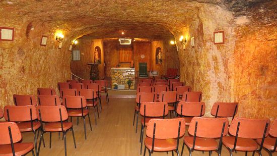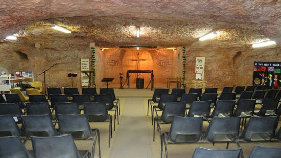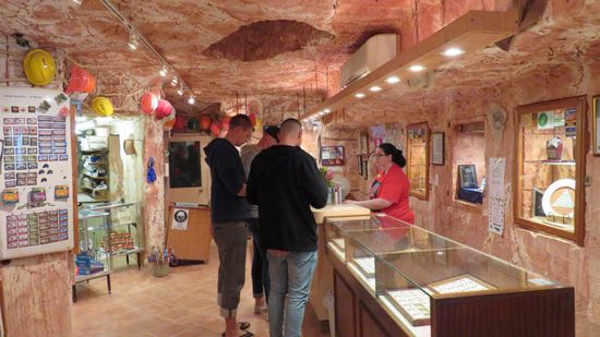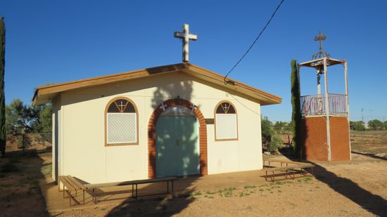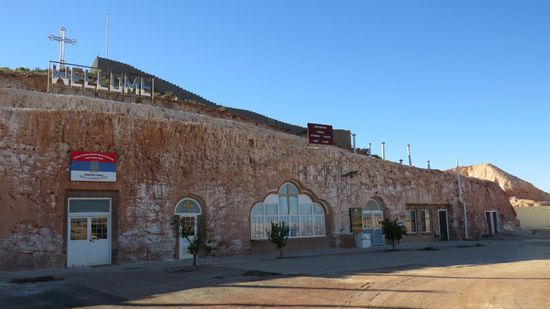 Hier in Coober Pedy ein Nebeneinader von mittlerweile 44 Nationalitäten, jeder auf der Suche nach dem grossen Glück, DEM Opal, der Ruhm und Reichtum bringt. Kein Wunder, dass hier auch so ziemlich alle Glaubensrichtungen mit ihren meist unterirdischen Kirchen vertreten sind. Mitten im Ort St. Peter and St. Paul, die katholische Kirche