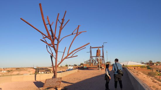 und auf den ersten Baum von Coober Pedy, der seine Existenz einem ausgebrannten Lastwagen verdankt.