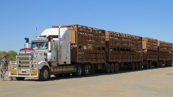 aber dank des würzigen Duftes, den dieses Roadtrain-Rindertaxi verbreitet suchen wir sehr schnell das Weite,