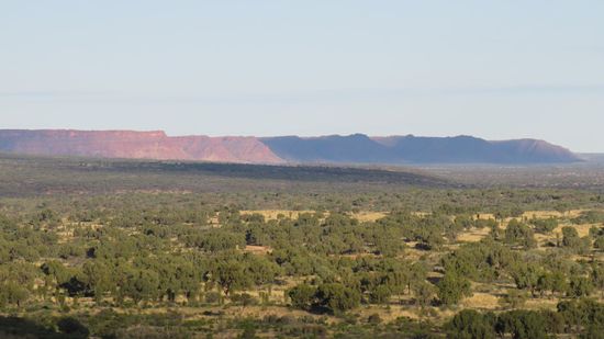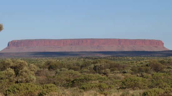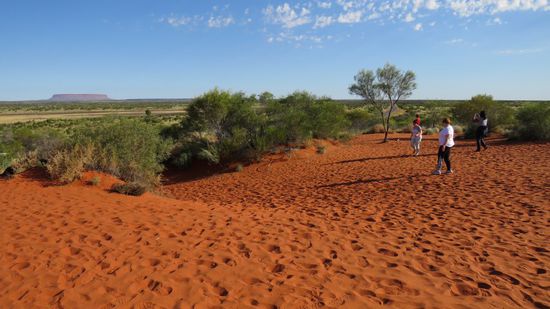 zum anderen von droben auf der Düne einen Blick auf den Mt. Conner selbst, ein Monolith, der nur in Begleitung eines Führers bestiegen werden darf, der von vielen Reisenden voreilig mit dem Uluru verwechselt wird,