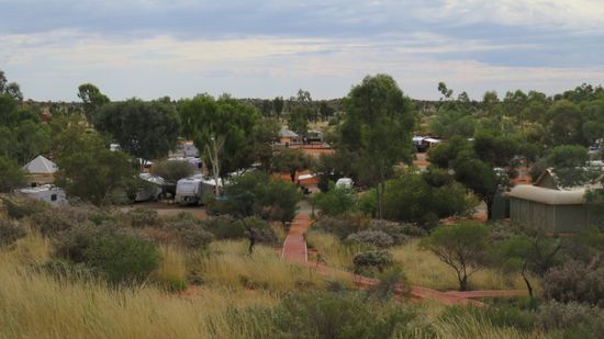 der Übernachtungen für AUD 40 aufwärts anbietet, ein sehnsüchtiger Blick vom Lookout auf Uluru,