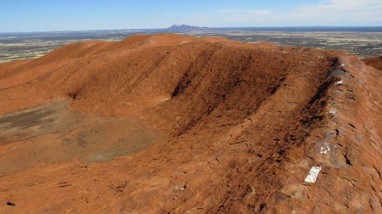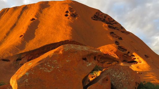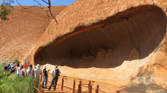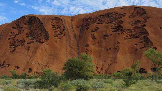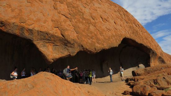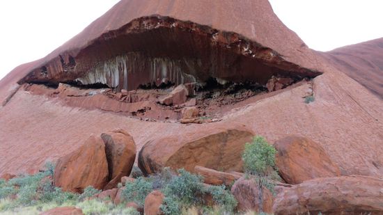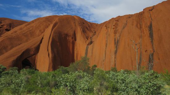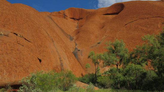 und schon kommt der erlösende Anruf: „Auto ist fertig, wir holen euch in 10min ab“. Wir fahren zurück in den Uluru NP, stellen fest, dass der Aufstieg immer noch gesperrt ist, wechseln wir halt zum Plan B, der einzigen anderen sinnvollen Wanderung die hier gemacht werden kann, ‚The Base Walk‘, die Umrundung dieses Felsklotzes auf einem 12km langen Kiesweg. Immer den Felsen neben sich, mal vorbei an ausgetrockneten Wasserfällen,