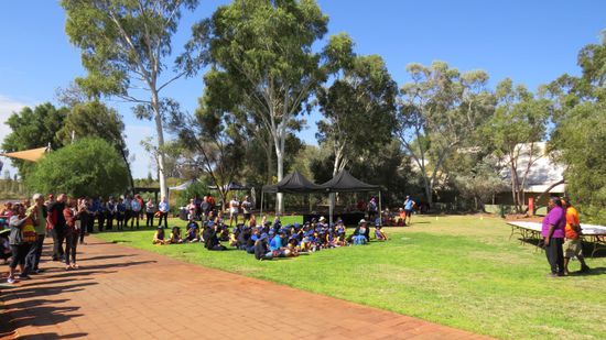 Am nächsten Morgen erneut ‚Regentropfen, die an das Fenster klopfen‘, der Climb natürlich wieder einmal geschlossen. Da Morgen das Uluru Camel Race stattfinden soll, beschliessen wir, hier nochmals einen Tag im Ressort totzuschlagen. Wir nutzen die Gelegenheit an der Feier zum 50. Jahrestag der Reconciliation Australia teilzunehmen,