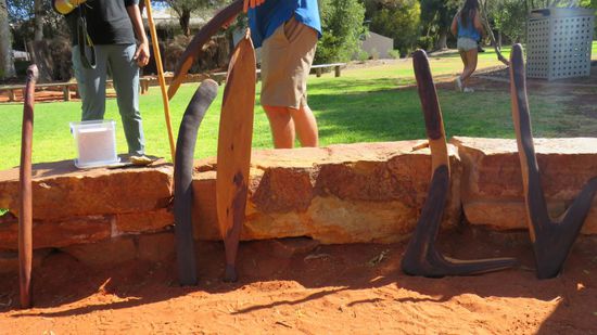 eine Zeitlang dieser Präsentation über einheimische Jagdwaffen (Bumerangs) und Jagdmethoden zugehört