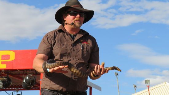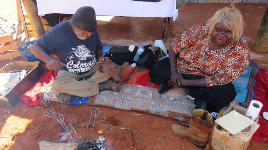 Wie das Schicksal so will, findet heute auch noch das Yulara Camel Race statt (E=AUD 10pP), Beginn war zwar um 11h aber da sich das Ganze bis 17h hinziehen soll, können wir noch nicht allzu viel versäumt haben. Als wir ankommen ist Pause, also schauen wir erst mal einem Aborigine bei Brandmalereien zu, beim dekorieren von Hüten (AUD 75) und Stiefeln (AUD 100).