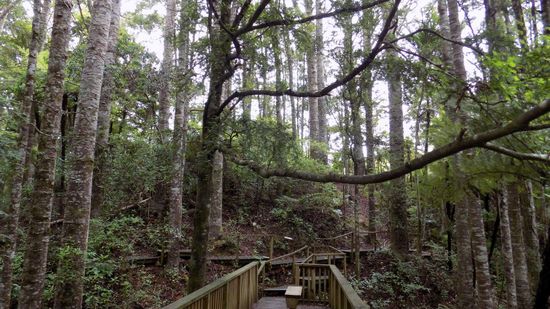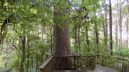 Wir fahren raus zum AH Reed Kauri Park, desinfizieren wieder einmal unsere Schuhe und besichtigen dann per Baumwipfelpfad ein paar etwa 500 Jahre alte Kauri Bäume auf ‚Augenhöhe‘.