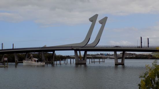 überqueren die futuristisch anmutende Fishing Hook Bridge,