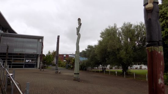 Am frühen Samstagmorgen besichtigen wir die 10 Totem Pfähle vor der Bibliothek
