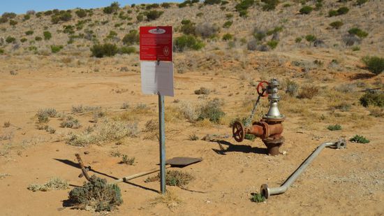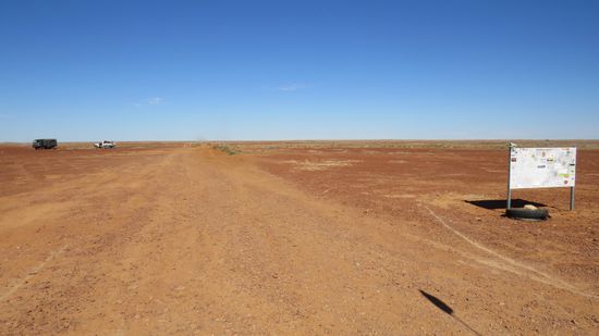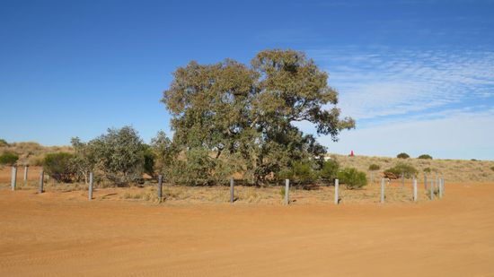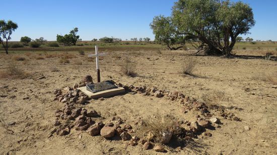 Im Dezember 1963 hatte diese Familie (Vater, Mutter und 3 Söhne) Probleme mit ihrem Auto auf ihrer Fahrt von Marree nach Birdsville. Der Versuch die nächste Station zu Fuss zu erreichen schlug leider fehl, alle fünf Personen konnten nur noch tot (verdurstet) aufgefunden werden. Die Route zu diesem Mahnmal ist nicht ausgeschildert, nur per GPS Daten, Fahrspuren und solchen Reifen-Hinweisen – hier muss man links abbiegen -