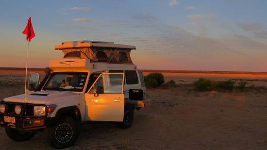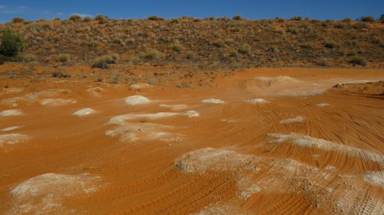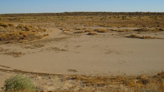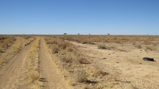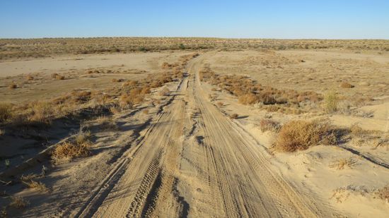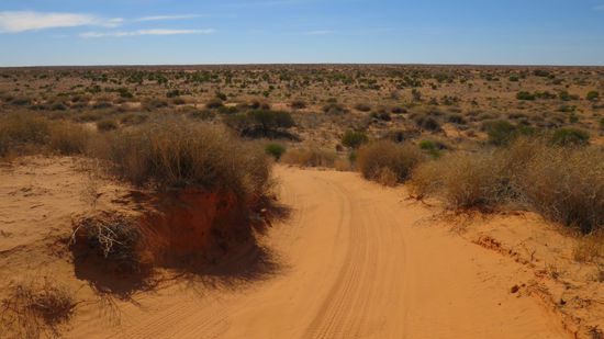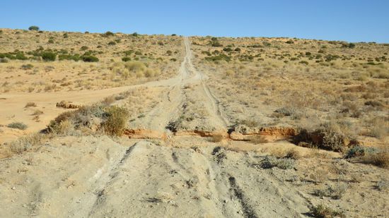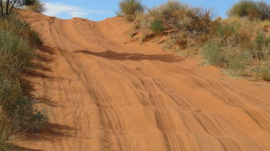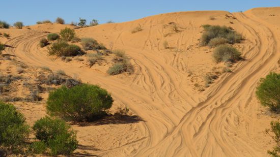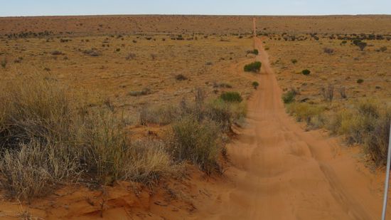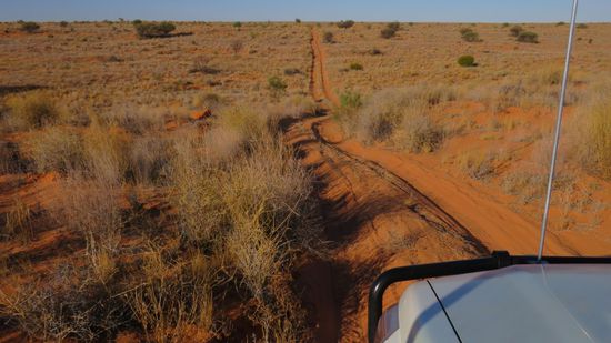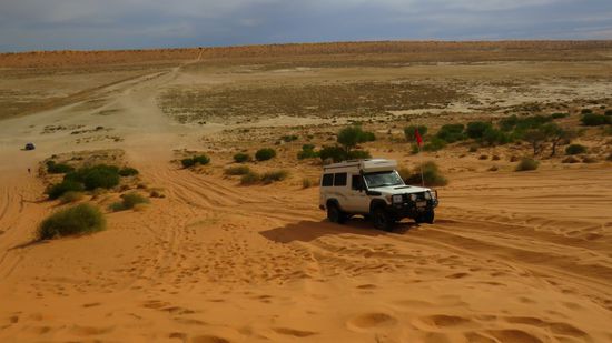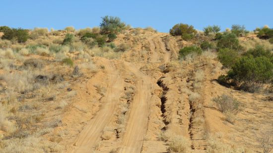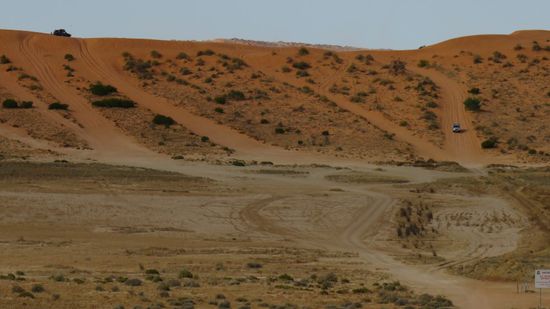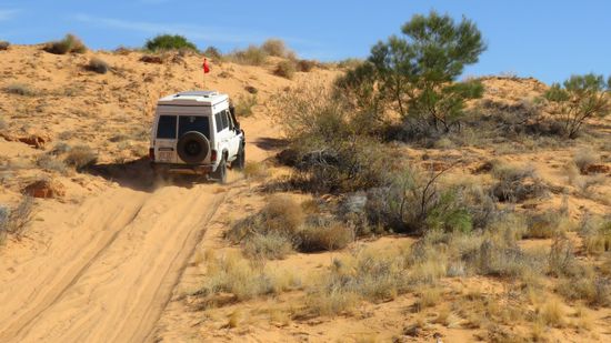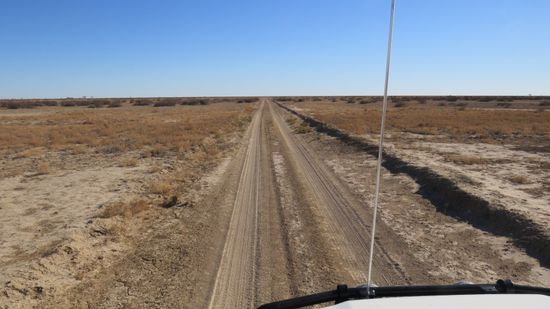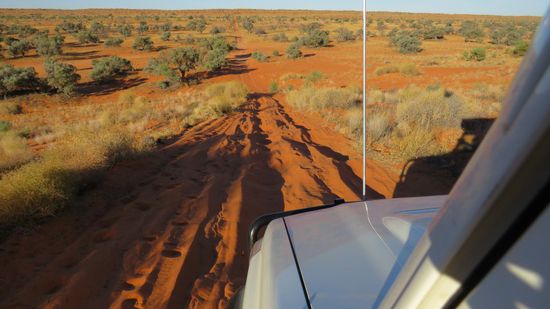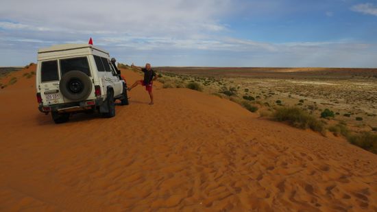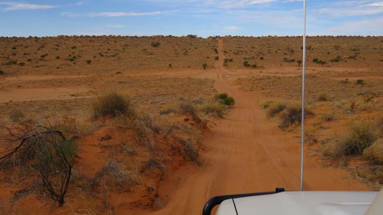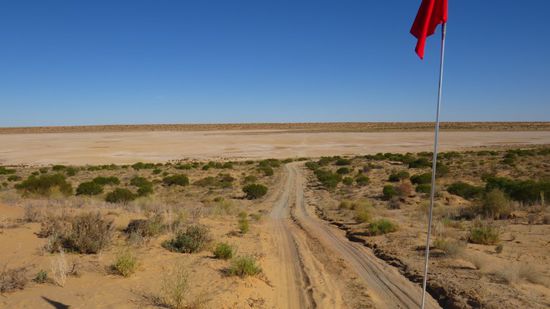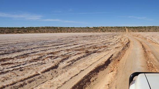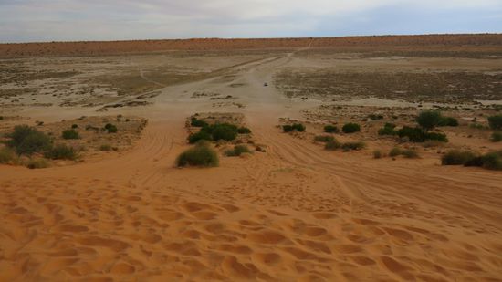 Auf den nächsten 50km sind ganze 10 kleine, einfach zu befahrende Sanddünen zu überqueren, meist fährt man jedoch an Tonpfannen (Claypan) vorbei,