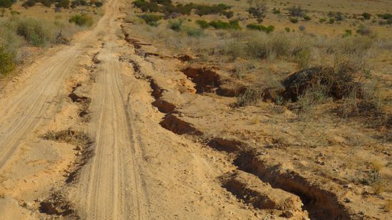 Wir fahren auf der Rig Road Richtung Nord-Westen und benötigen für die nächsten 110km gerade mal 3h. Die Rig Road wurde einst zur Beförderung von Ölbohr- und Förderausrüstung angelegt und damit die schweren Road-Trains einfacher durchs Gelände, über die Dünen kommen, wurde der Track ‚clay capped‘, der Sandboden wurde mit einer dicken Tonschicht überdeckt, verdichtet. So bekam man eine tolle Piste, die heute jedoch nicht mehr für schwer Lastverkehr benötigt und daher auch nicht mehr gewartet wird. Da Ton ja so schön wasserabstoßend ist hat das den Nebeneffekt, dass selbst der kleinste Regenguss reissende Sturzbäche erzeugt, die den Strassenrand langsam aber sicher unterspülen – und entsprechend sind die Auf-