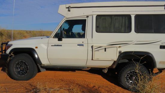 Wir legen eine kurze Fahr- und Rechenpause ein, diskutieren darüber ob wir diese Schleife um weitere 120km ausdehnen sollen / können, aber nach den letzten Erfahrungen mit SL3’s Dünendurst beschliessen wir ‚auf Nummer sicher‘ zu gehen, den Umkehrpunkt für diese Wüstenrundfahrt erreicht zu haben. Wir hätten damals halt doch für AUD 1.500 den 90l Zusatztank durch einen 180l grossen Tank ersetzen lassen sollen, aber hinterher ist man(n) immer schlauer…