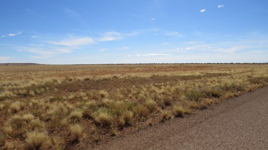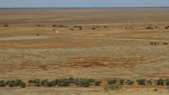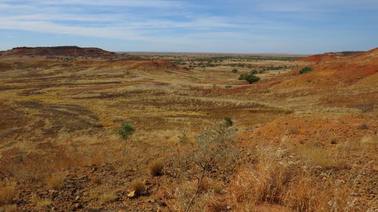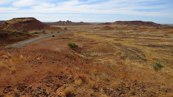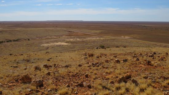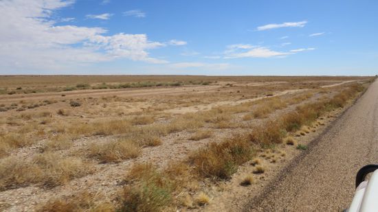 Nach 50km der erste Hügel in dieser Landschaft, der natürlich zu einem Lookout ausgebaut wurde. Hier droben erfahren wir, dass wir uns mitten in einem ehemaligen riesigen Binnensee befinden, der damals langsam aber sicher verlandet ist. Daher auch diese ebene Landschaft, dieses Sedimentgestein. Noch ein Blick zurück,