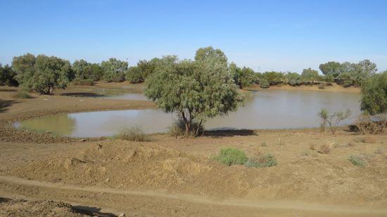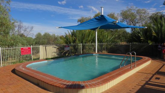 lässt uns in dieser totlangweiligen Landschaft allein. Wir erreichen Bedourie, mit seinen 124 Ew. nicht unbedingt der Touristenort, wenn da nicht dieses von einem artesischen Brunnen gespeiste 40° warme Badebecken wäre, das zum Verweilen einlädt. Wir bleiben erst mal hier, holen uns im Info-Center gegen AUD 50 Pfand einen Schlüssel für das Tor zum Bad, der Eintritt selbst dagegen ist kostenlos!!!, verbringen den Nachmittag im Thermalbad, die Nacht ganz in der Nähe, den nächsten Morgen schon wieder im Thermalbad