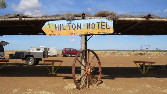 eine der 9 Pferdewechselstationen auf dem Weg von Boulia nach Winton, heute ein ‚rustikales‘ Roadhouse und ein WoMo SP, der den Namen ‚Hilton Hotel‘ -