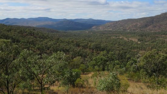 trotzdem bläst der Trompeter weiter vor sich hin. In Alpha, der bereits obligatorische Besuch in der Bäckerei, deren Pies (Pasteten) wir einfach nicht wiederstehen können. Auf 444m Höhe wird die Great Dividing Range, die Wasserscheide überquert, bevor uns der Drummond Range Lookout einen langen Blick auf die immer noch vor uns liegende Gegend bietet.