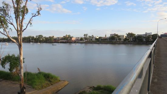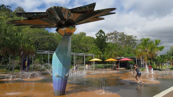 Sonntagmorgen, wir lassen es langsam angehen, wandern nach dem Frühstück erst mal ins nahegelegene Einkaufszentrum, bevor wir dann am Nachmittag uns erneut auf den Weg in die Innenstadt machen. Leider hat vor zwei Jahren einer dieser Zyklone, Regenstürme, auch hier im Park größere Schäden angerichtet, an deren Beseitigung immer noch gearbeitet wird, der halbe Park ist immer noch geschlossen, wir müssen leider anstatt quer durch den Park außen rum entlang einer vierspurigen Ausfallstrasse gehen. Wir überqueren erneut den Fitzroy River,