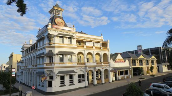 bevor wir nach Rockhampton zurückkehren um von dort aus unsere Weiterreise Richtung Süden, Richtung Brisbane anzutreten. Heute schaffen wir es noch bis zur Raglan Tavern am Hwy A1, die nicht nur das berühmte Tooheys Old (ein leckeres Dunkles) ausschenkt, sondern Nachts auch noch ihren riesigen Parkplatz als SP den reisemüden Campern überlässt und dazu noch zwei Warmduscher-Kabinen für Trucker und Camper bereithält. Wir waren zwar fast allein auf dem Platz, aber die im Stunden-Takt vorbeidonnernden, zwischen 50 und 100 Waggons langen Kohlezüge und die zahllosen Road-Trains lassen kein Gefühl der Einsamkeit aufkommen.
