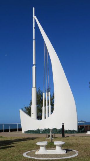 die bei +/- 20° hier das Wasser und die Sonne geniessen, den in unseren Augen recht frischen Wind einfach ignorieren – während wir Weicheier unsere Fisch & Chips drinnen im Restaurant und nicht draussen auf der zwar sonnenbeschienenen aber dennoch winddurchwehten Terrasse geniessen. Noch ein kurzer Erinnerungsbesuch beim Singing Ship in Emu Park,