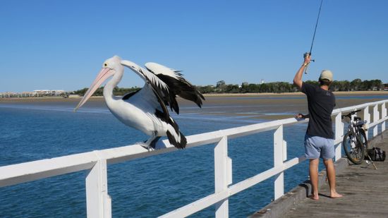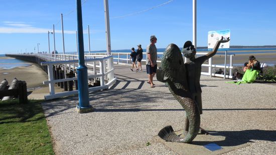wir bew(u)andern nochmals die nach der letzten Renovierung übriggebliebenen 880m den Urangan Pier entlang, aber heute scheinen die Fischer weniger Glück als bei letzten Mal zu haben, kein Thunfisch in Sicht, selbst der Pelikan schaut gelangweilt aufs Wasser,