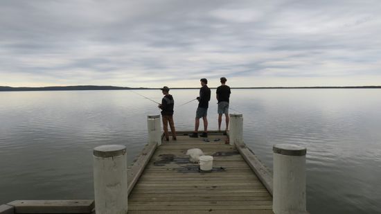 und nur dieser Knabe am Eingang zum Pier ‚Fette Angler-Beute‘ verspricht.