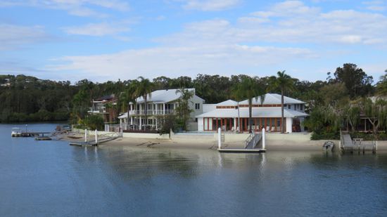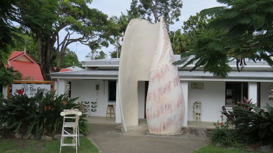 eine ‚atemberaubende‘ Konstruktion aus Glasfaser und Maschendraht, die den Eingang eines ‚Tropic Shops‘ (Souvenirmuschelverkaufsanstalt) ziert. In Noosaville müssen wir erst einmal diesem Bettler den Unterschied zwischen mein (unsere Fish and Chips Portion) und sein (wir spenden nichts) erklären,