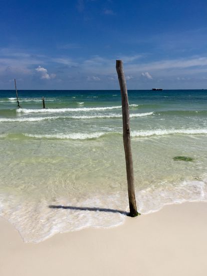 Am Bai Sao angekommen finden wir wie erwartet weißen Sand, blaues Meer und Palmen - an sich traumhaft schön! Leider gibt es viele Touristen (hier treiben die sich also alle rum), aus einem Strandcafe dröhnt Musik, Müll liegt am Strand und schwimmt im Wasser. Aber darüber lässt sich dank des sonst so schönen Panoramas hinwegsehen
