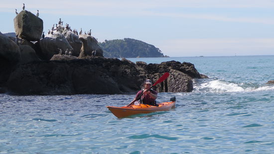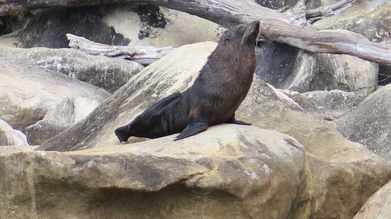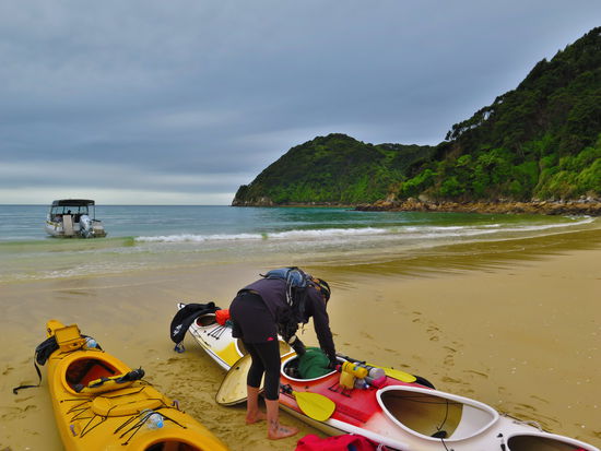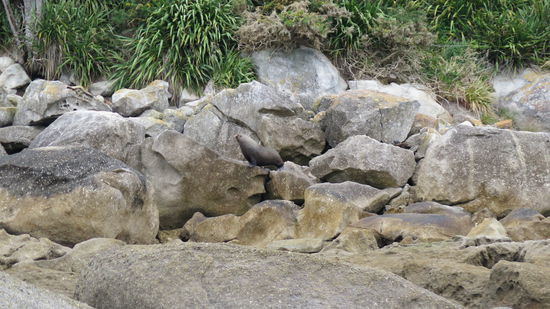 Heute ging es früh aus den Federn, um es bis 8.30am zum Startpunkt in Marahau zu schaffen. Frühs haben wir uns noch leise verhalten, da wir dachten, dass zumindest einer unserer Gastgeber noch schlafen würde. Wie sich raus stellte waren jedoch beide samt Hund beim sporteln. Ungeahnterweise alleine im Haus, haben wir uns selbst das Frühstück zubereitet und für die spätere Weiterfahrt gepackt. Kurz konnten wir jedoch noch Goodbye sagen, da wir auf dem Weg zum Auto die beiden doch noch getroffen haben. Ab nach Marahau zu „Abel Tasman Kayaks“. Am Vortag haben wir uns für eine Kayaktour eingebucht. Mit dem Wassertaxi sind wir den ganzen Weg hoch nach Awaroa gefahren, um von dort aus ein gutes Stück bis nach Onetahuti zu paddeln. Kurz noch ein paar Erklärungen was man alles beachten sollte etc. und schon ging es ab ins Kayak und raus aufs Wasser. Heute war uns zwar die See gut gesonnen, aber das Wetter über uns eher nicht. Wieder mal alles bewölkt. Insgesamt hatte unser Guide drei Touris zu bespaßen, wobei wir unser eigenes 2er-Kayak hatten. Man hat sich im Vorfeld schon darauf eingestellt, dass es anstrengend werden könnte, was sich im Verlauf der Tour auch wirklich bemerkbar machte. Belohnt wurden wir jedoch mit ein paar tollen Sichten vom Meer aus auf die vielen kleinen verlassenen Buchten und Steinformationen, auf denen immer wieder ein paar Robben zu sehen waren. Eine war sogar so neugierig, so dass sie relativ nahe an unseren beiden Kayaks vorbei schwamm. Ziel in Sicht und kurze Rast inklusive Mahlzeit. Jetzt war es wieder soweit. Wandern war angesagt. Pünktlich hat sich das Wetter nun doch noch tatsächlich verschlechtert und es regnete. Gut dass am Vortag noch in der Wettervorhersage laut I-Site Sonne gemeldet wurde. Dadurch hatten wir natürlich auch keine weiteren Regenjacken dabei. Naja, Pech gehabt. Die 5km haben wir dann doch mit voller Wanderslust erfolgreich bestritten. In der Bark Bay wurden wir schließlich auch wieder vom Wassertaxi abgeholt. Welch erfreulicher Blick aufs Boot, als man sah, dass man ganz hinten und ungeschützt vom Regen sitzen durfte. Wäre ja alles wohl nicht soooo schlimm gewesen, wenn man beim losfahren nicht auch noch die voll Ladung Wasser abbekam, was sich auf dem Dach des Bootes gesammelt hatte. So, eine gefühlte Ewigkeit musste man dann auch noch dem Fahrtwind trotzen bis man durchnässt und durchfroren wieder ankam.