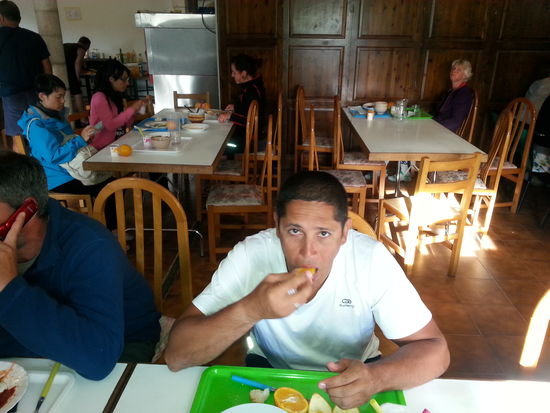 Nachdem wir unsere Rucksäcke gepackt hatten gingen wir runter. Unten gab es Frühstück. Im Raum konnte man kleine Armbänder und Ketten aus Holz kaufen. Jetzt fand ich auch eine kleine Dose in die man Geld für Frühstück, Abendessen und mitgenommenen Ketten einstecken konnte. Jeder gibt soviel er kann. Ich freute mich, dass ich konnte und es machte mir hier Spaß zu können . Außerdem nahm ich zwei Ketten für meine Tochter mit.