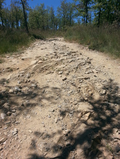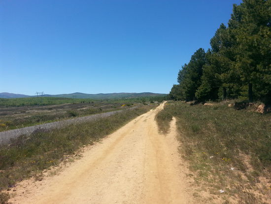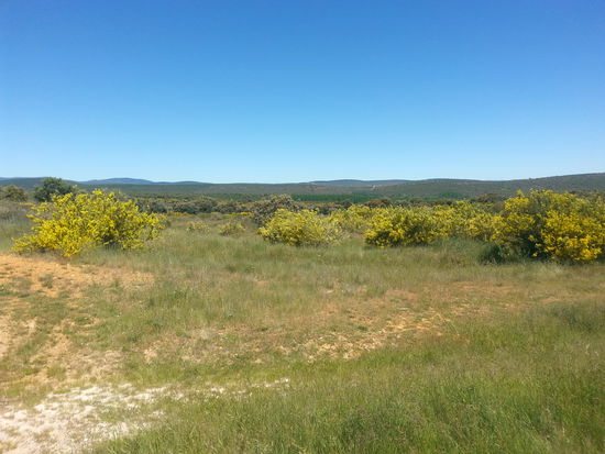 Es ging auf staubigem Wege auf einer Hochebene Richtung Wegkreuz von Santo Toriblo. Ab hier konnte ich spüren, dass die Meseta durchquert war, denn die Landschaft änderte sich. Es war nun tatsächlich vorbei mit den Getreidefeldern bis zum Horizont. Es wurde bergiger, strauchiger und es kamen Bäume dazu.
