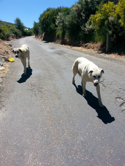 Am Ortsausgang von Al Acebo ging ich hinter eine Böschung um meine lange Hose gegen eine kurze zu tauschen. Als ich mit meiner Hand tief in meinem Rucksack war spürte ich das neben mit irgendjemand stand. Ich erschrak total als ein großer Hund neben mir stand. Der hatte sich so dermaßen angeschlichen, das war echt der Hammer. Dazu kam noch das er seinen Kumpel im Schlepptau hatte. Die beiden standen links und rechts neben mir und schauten mir seelenruhig zu wie ich meine Hose in den Rucksack packte. Als ich wieder alles zusammengepackt hatte begleiteten sie mich auch noch bis zum Ortsausgang.