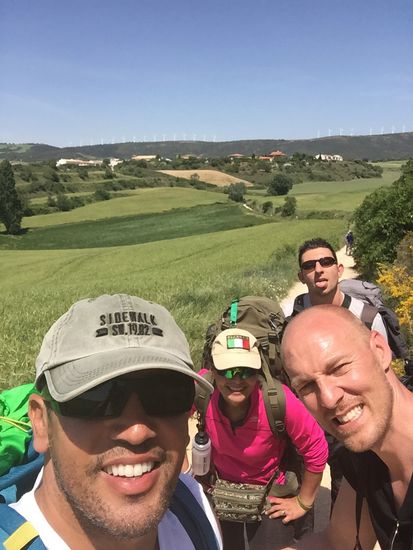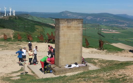 Oben an der Passhöhe kamen wir an den Punkt wo die Eisenfiguren stehen. Abseits von den Figuren stand ein kleiner Verkaufswagen. Oben war es so cool. Wir trafen den athletischen 60 jährigen wieder mit dem wir auf dem Weg nach Roncesvalles gegangen waren. Wir setzten uns, tranken Cola und aßen Chips (dank des Verkaufswagens). Die Stimmung war so cool. Wir saßen mit Australiern, Kanadiern, Kiwis und Amerikanern vor den Eisenfiguren. Mir fiel zum ersten Mal auf, wie glücklich ich sein konnte, den Weg schmerzfrei zu gehen. Die meisten hatten mittlerweile mit teilweise schlimmen Blasen oder irgendwelchen Wehwechen aller Art zu kämpfen.