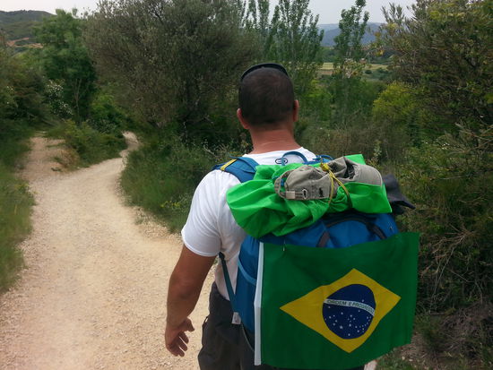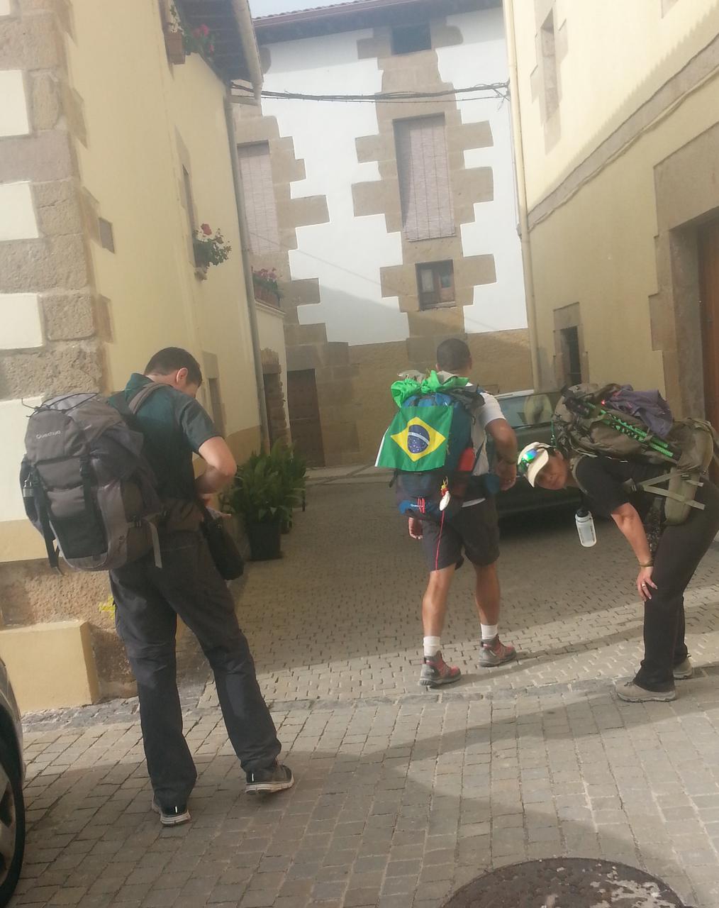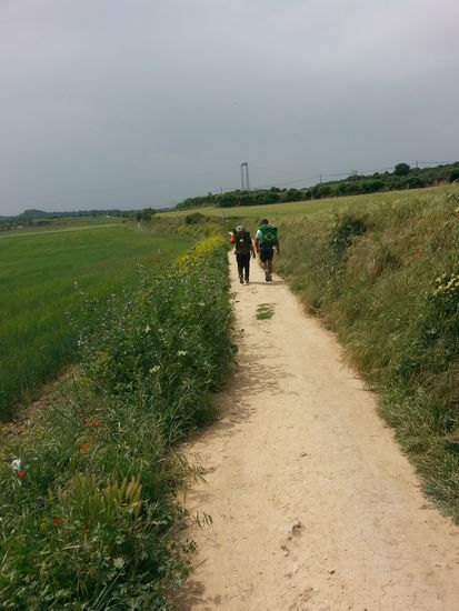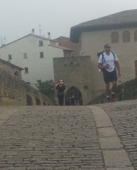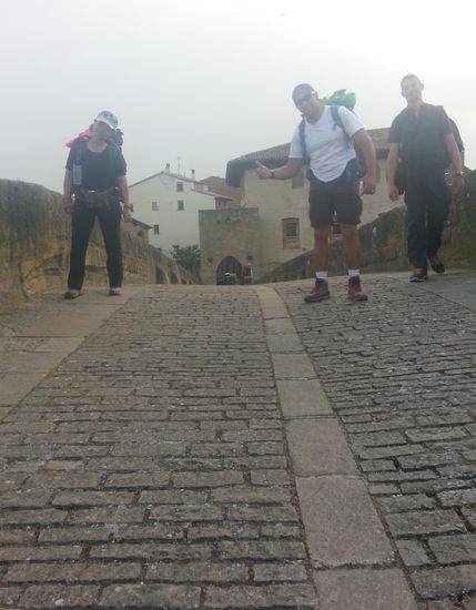 Wir sind morgens ziemlich spät aufgestanden und kasperten beim Rucksackpacken noch rum. Im Frühstückssaal waren die essbaren Sachen schon so ziemlich abgegrast. Trotzdem fanden wir noch das ein oder andere Essbare. Da wir danach noch aufs Zimmer gingen, Nilton noch rausfand, dass eine Frau aus der Herberge aus Brasilien kam und wir anschliessend noch Marias vergessene Jacke aus der gestrigen Bar rausholten, war es schon relativ spät als wir über die Brücke von Puente la Reina gingen.