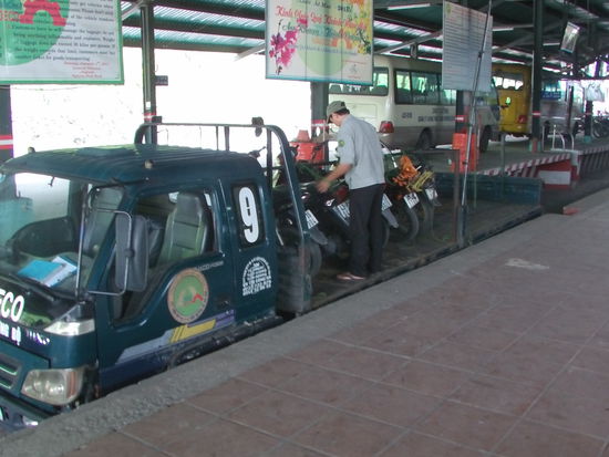 Unterwegs musste ich wieder den Wolkenpass bezwingen. Er ist die Wetterscheide zwischen Nordvietnam von Südvietnam. Das letzte Mal bin ich im strömenden Regen über die Berge gefahren, weil Mopeds nicht durch den 7 km langen Tunnel dürfen. Diesmal habe ich diese Station entdeckt. hier werden die Zweiräder auf einen Lkw geladen und so durch die Röhre transportiert. Die Passagiere fahren im Bus hinter her.