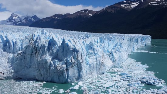 Der Perito Moreno Gletscher (5 km breit und 60 m hoch). Einer der wenigen argentinischen Gletscher, die nicht an Größe verlieren. Und trotzdem kommt er pro Tag bis zu 2 m voran und "kalbt" in seiner Gletscherzunge ständig neue Eisberge.