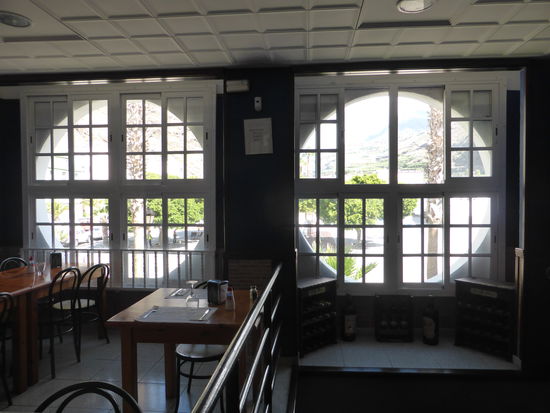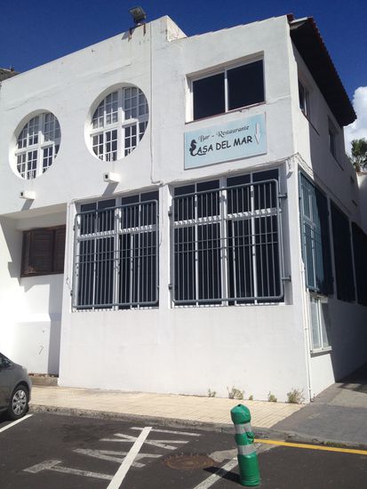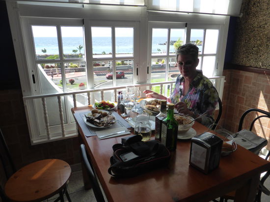 Unser letztes palmerisches Essen wollen wir in der Casa del Mar einnehmen, die zwar von außen wenig einladend, da mit Gittern im Erdgeschoß versehen, wirkt, aber innen und im Obergeschoß wo sich das Restaurant befindet sehr hell ist. Durch Rundfenster kann man auf den Hafen und das Meer schauen. Ulrike bestellt sich eine Dorade und eine Portion Gofio. Ich nehme das Menü mit Suppe, Salat und einer Mischung von Fischen. Beide Portionen sind richtig groß, nur die Suppe ist reichlich dünn. Der Wein in der Karaffe ist sehr gut und der Café Solo hinterher ebenso stark.