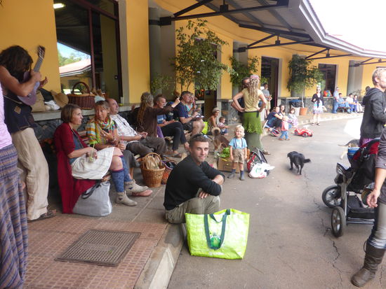 Vor der Halle stehen scharenweise Aussteigertypen mit den üblichen zahlreichen Hunden, Rastamähnen und Wollsocken bei 25Grad Celsius.