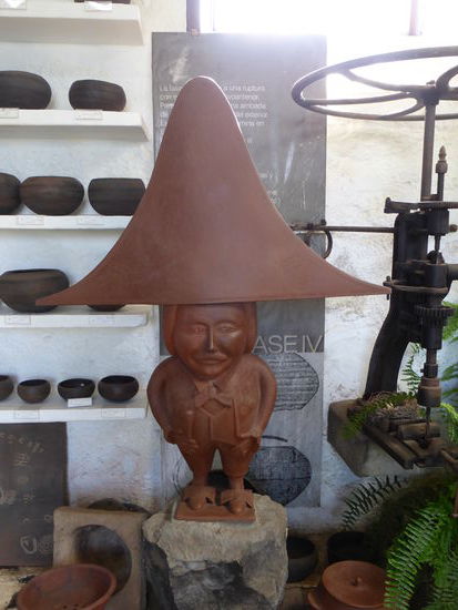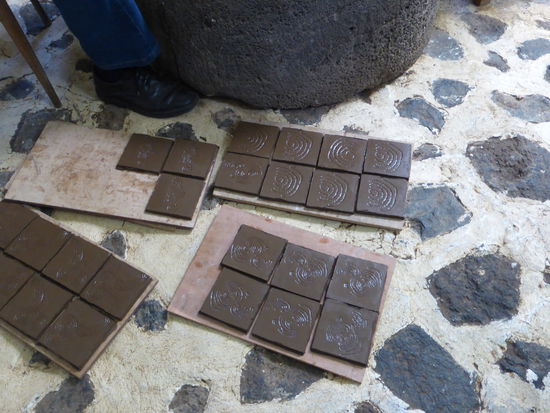 Dann führt er uns ein Stockwerk höher ins ‚Museo’ und schaltet einen kurzen Videofilm ein, der die Produktion der Keramiken zeigt. Der mit Steinen durchsetzte Lehm wird erst einmal gewaschen, d.h. mit Wasser gemischt und gesiebt. Dann trocknet er in einem Absetzbecken bis zu einer bestimmten Konsistenz, um dann in großen dicken Platten im Keller weiter zu trocknen, bis er mit den Händen formbar wird. Was in dem TV-Film unterging, ist dass hier nicht an der Drehscheibe getöpfert wird, sondern die Schalen mit den Händen genauestens geformt werden.