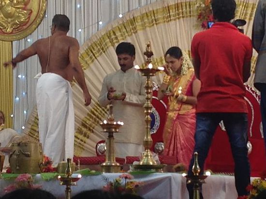 Halb zehn fahren wir dann los zum Auditorium des Jaya Hotels. Natürlich sind wir auch hier wieder die Sensation, zumal wir heute alle drei in traditioneller Indischer Kleidung erscheinen. Dort treffen wir Raouf den früheren Ayurveda Arzt vom Deshadanund Shah, den Nachtwächter, der sich wie immer sehr freut uns zu sehen und noch mehr, als er hört, dass wir ab Sonntag für eine Woche ins Deshadan kommen. Das hat ihm wohl noch niemand verraten. Wir nehmen Platz im Saal und dann geht es auch schon los. Es beginnt mit dem Einlauf des Bräutigams. Voran gehen drei Musiker und hinter ihm seine Familie mit Blüten und brennenden Lichtern in den Händen. Sie geleiten ihn bis hinauf auf die festlich geschmückte Bühne, dann erfolgt die gleiche Prozedur erneut mit der Braut. Musikalisch begleitet von den Musikanten, die sich an der Seite der Bühne platziert haben, werden die verschiedenen Rituale einer Hinduistischen Hochzeit vollzogen. Das Brautpaar legt sich gegenseitig Goldketten und Blumengirlanden um den Hals. Sie werden gesegnet mit einem orangen Pulver, das ihnen auf die Stirn getupft wird, müssen die Hände kurz über eine Flamme halten, bekommen Kräuter oder kleingeschnittene Blätter auf den Kopf gestreut, werden mit Banane und Milch gefüttert und schließlich umrunden sie Hand in Hand, wobei der Bräutigam voraus geht, mehrmals das rituelle Zentrum der Bühne. Dann geht die Fotografier-Arie los. Das Brautpaar nimmt wieder auf seinen "Thronsesseln" platz und wird nun eine Ewigkeit in den verschiedensten Konstellationen fotografiert, unter anderem auch mit uns. So voll wie der Saal ist, dauert das natürlich eine ganze Weile. Während der gesamten Zeit hält ein Team von Kameramann, Fotograf und Beleuchtern das ganze Geschehen ununterbrochen auf Bildern fest. Im Gegensatz zu der Hochzeit, bei der wir 2012 dabei sein durften, wo alle immer nur bierernst dreingeschaut haben, lächelt das Brautpaar diesmal auch immer mal für die Fotos und es wird öfter gelacht. Aber Sajin ist ja auch ein lustiger Mensch und wie schön, dass seine Braut Divya zu ihm zu passen scheint, denn die lacht kräftig mit. Und hübsch jst sie auch.