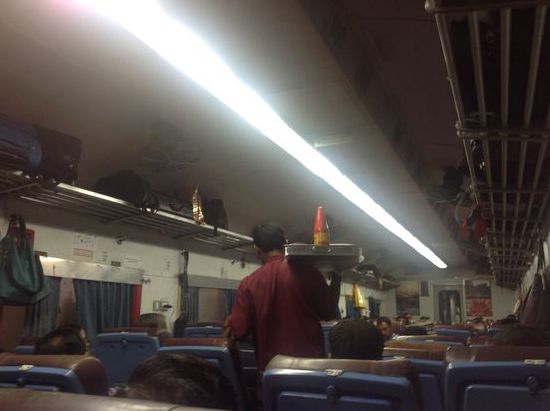 Kaum dass wir losgefahren sind, und ab da in kurzen regelmäßigen Abständen, kommen verschiedene Getränke- und Essensverkäufer durch den Zug. Es gibt, Chai, Kaffee und kalte Getränke, Süßigkeiten, verschiedene Biryanis, Gemüsekringel und -frikadellen mit Chutney und in Teig ausgebackene Jackfrucht?? und am Abend dann Tomatensuppe und Omette. Wir lassen uns einiges davon schmecken. Das einzige, was es an diesem Zug zu bemängeln gibt, ist das Klo. Bereits bei unserem zweiten Halt stinkt es bestialisch nach Urin und zwar bis auf den Bahnsteig raus. Während der Fahrt in unserem Waggon ist es OK, solange die Tür nur kurz geöffnet wird. An den Haltestellen stinkt es allerdings auch bis zu unseren Sitzen rein, die sich gleich in der zweiten Reihe hinter der Tür befinden. Zum Glück werden die Toiletten an der dritten Station gereinigt, denn die ganze Fahrt ohne zu pinkeln, hätte ich bestimmt nicht ausgehalten.