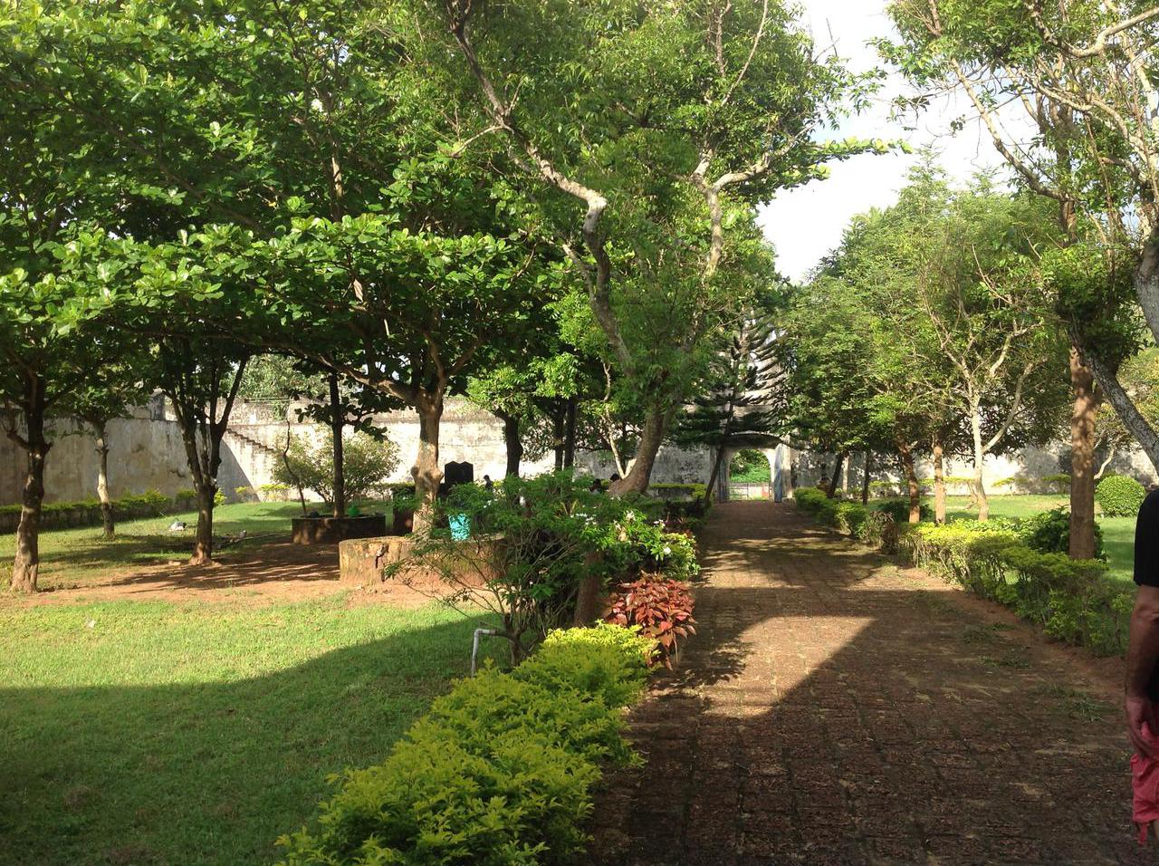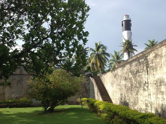 Auf dem Rückweg machen wir Halt am Anjengo Fort mit dem Leuchtturm. Es wurde 1695 erbaut und war eine der ersten Niederlassungen der East Indian Company in Indien. Eigentlich besteht es lediglich aus einem großen Innenhof mit dicken Mauern außen rum. Beim Betreten müssen wir uns in ein Gästebuch eintragen. Es liegt an einem Brunnen im Zentrum der Anlage, wo einige Jünglinge und ältere Herren damit beschäftigt sind, Kokosnüsse aufzuschlagen. Dann fahren wir wieder zurück ins Hotel. Inzwischen sind auch Sandeep und Shah aufgetaucht. Shah hatte hohes Fieber und hatte deshalb im Krankenhaus zwei Spritzen bekommen. Jetzt geht es ihm wieder gut. Mit dem Darts spielen wird es auch heute nichts, denn der "Hausmeister" hat immer noch nicht die Konstruktion gebaut, mit der man die Dartscheibe an verschiedenen Orten aufstellen kann. Abhilash hat gesagt, dass die Anbringung an der Palme zu gefährlich ist, denn dahinter ist die unbeleuchtete Straße und die Anfänger werfen die Pfeile ständig daneben. Das könnte mal einen Fußgänger treffen.
