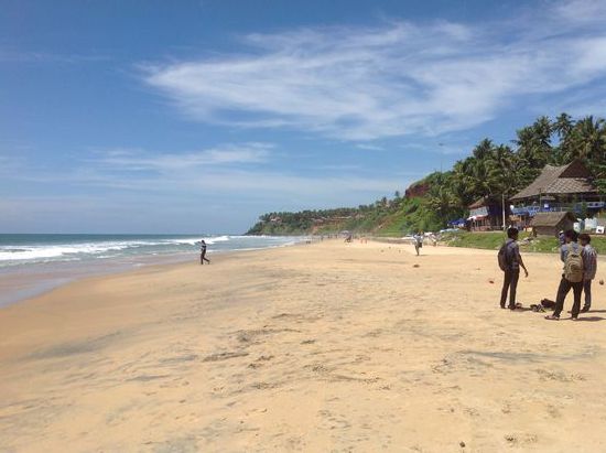 Der heutige Tag empfängt uns mit strahlendem Sonnenschein. Nach dem Frühstück organisiert uns Abhilash unser Auto und so machen wir unseren ersten Ausflug in die Stadt. Seltsamerweise sind alle Geschäfte und Tankstellen geschlossen. Wie ich später von Abhilash erfahre, wird heute gestreikt; er vermutet, dass es im Zusammenhang steht mit der gestrigen Wahl. Wir fahren zum Strand von Varkala, der außerhalb der Hauptregenzeit viel breiter und länger ist, als wir ihn kennen. Unser Mittagessen nehmen wir wieder im Little Tibet ein, das inzwischen 'Tibetan Kitchen' heißt. Nicos neues Lieblingsessen sind die Auberginenröllchen und ich nehme die vegetarischen und gebratene Spinat-Momos bestellen wir auch noch.
