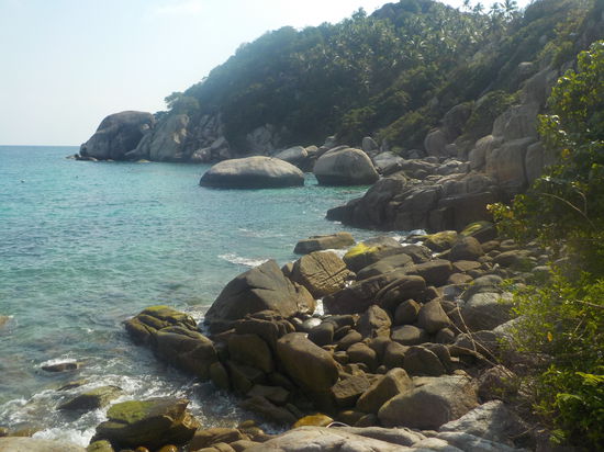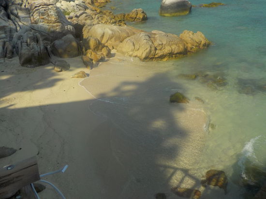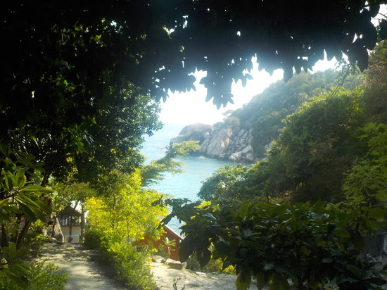 Los geht's! Zuerst schauen wir uns Nang Yuan an. Wir landen an einem Resort direkt am Wasser. Den Hang hinuntergelaufen, kommen wir an einer Aussichtsterrasse aus, wo wir einen frischen Obstsaft trinken und einen schönen Ausblick auf Nang Yuan haben. Danach fahren wir weiter zum Mango Bay. Den Aussichtspunkt lassen wir dann aber aus. Weiter geht es zum Shark Bay - dort soll es Schildkröten zu sehen geben. Die sehen wir zwar nicht, trotzdem ist diese Bucht wunderschön! Wie ein Postkartenfoto! Wir genießen die Aussicht auf das Wasser (auch ohne Schildkröten) und beschließen morgen eine Bootstour um die Insel zu machen. Die Chance dabei alle Buchten zu sehen, ist größer als auf eigene Faust mit dem Roller los zu fahren und die Wege zu suchen. Die sind nämlich abenteuerlich. Rauf und runter, kurvenreich und ausgespült vom Regen.