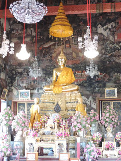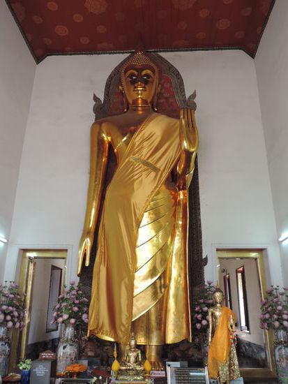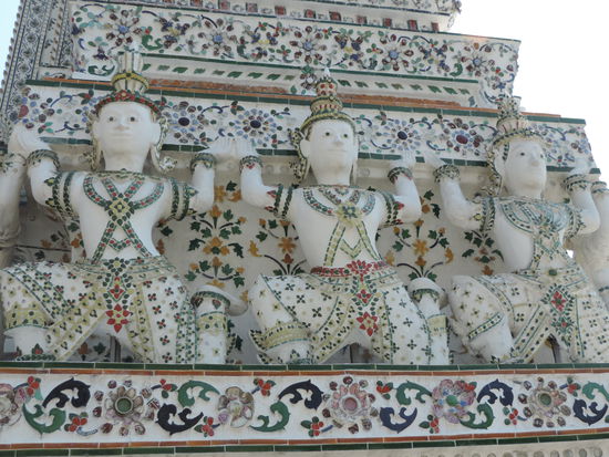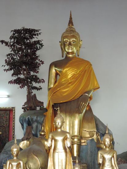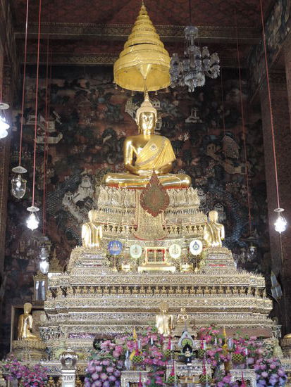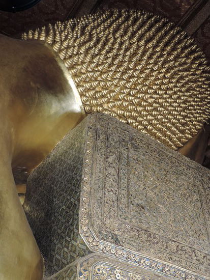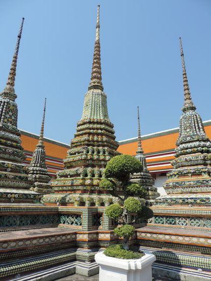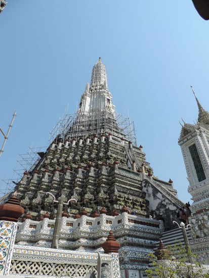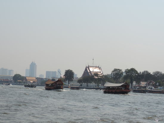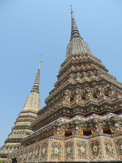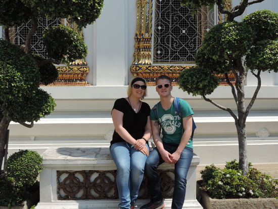 Heute morgen sind wir relativ früh wach geworden. Im ganzen Zimmer hängt unsere Wäsche verteilt. Wir haben alle Schnürsenkel und Bänder die wir im Rucksack gefunden haben zusammen gebunden und daran unsere Wäsche aufgehangen. Ein Teil ist auch schon trocken. Wir gehen runter in den Gemeinschaftsbereich und machen uns erstmal einen Kaffee - kostenlos Gegen 10:45 Uhr machen wir uns auf den Weg. Heute wollen wir uns Wat Pho und auf der anderen Flussseite, direkt gegenüber, Wat Arun angucken. Wir gehen zu Fuß los, in der Hoffnung ein Tuktuk zu ergattern. Der erste Fahrer möchte 400 !!! Baht von uns haben. Andere haben uns für 150 Baht dorthin gefahren. Für 500 Baht sind wir 45 Minuten zum Flughafen gefahren worden!!! Unfassbar! Aber dann kommen wir an der Bootsanlegestelle vorbei und entscheiden uns heute für den Weg übers Wasser für 40 Baht! Zuerst besichtigen wir Wat Pho. In jedem Gebäude ist ein anderer Buddha zu sehen. Also 8 an der Zahl! Alle Gold und von noch mehr Gold und blinkenden Steinen umgeben - Wunderschön! Wir halten uns, auch hier, bestimmt 3 Stunden auf und sehen uns um. Fasziniert sind wir von dem liegenden Buddha! Wie riesig der ist! In den Gängen um die gesammten Gebäude herum sind auch überall Buddhastatuen zu sehen. Wir bekommen bei einer Führung mit, dass diese auf Gräbern stehen. Und tatsächlich sieht man unter den Statuen Gravuren und Bilder von Verstorbenen. Nachdem wir uns alles angesehen haben, fahren wir mit der Fähre über den Fluss und besichtigen dort Wat Arun. Ist auch sehr schön anzusehen, allerdings konnte man dort nicht so viel sehen, denn dort finden Bauarbeiten statt. Trotzdem müssen wir 50 Baht Eintritt zahlen. Da haben wir bei Wat Pho für 100 Baht bedeutend mehr geboten bekommen. Wir fahren relativ schnell zurück und laufen zu Fuß zur Kao San Road. Dies ist eine große Einkaufsstraße. Hier schauen wir uns die Strassenstände an und kaufen auch noch ein paar neue Klamotten für mich. Zurück ins Hostel fahren wir wieder mit dem Tuktuk. Ich bin immer wieder erstaunt, wie gelassen die Menschen hier sind, trotz des wahnsinnigen Verkehrs! Als wir am Hostel angekommen sind, glauben wir an einer Abgaßvergiftung zu leiden! Krass, was vor allem die Busse hier ausspucken! Da bekommt man keine Luft mehr. Kein Wunder das die Tuktuk-Fahrer fast immer Mundschutz tragen!