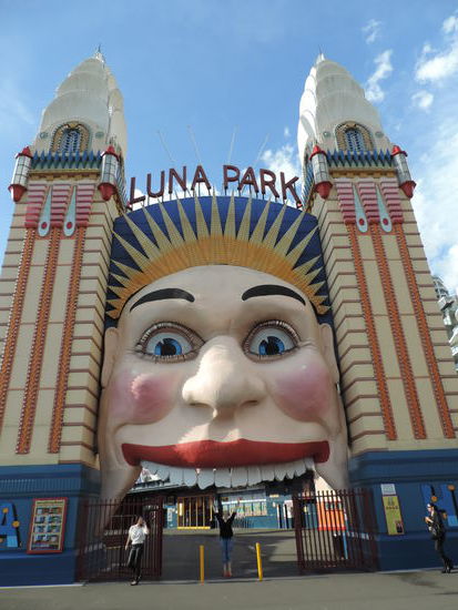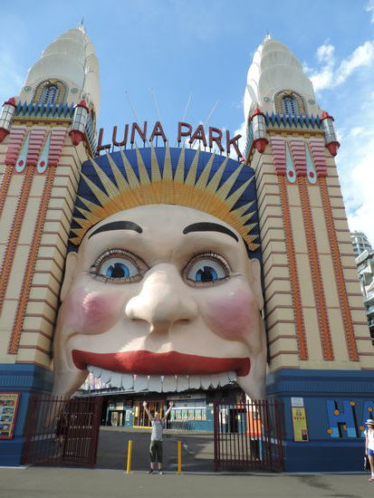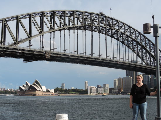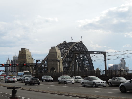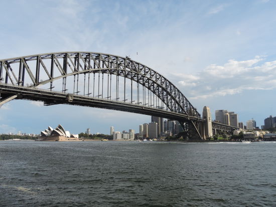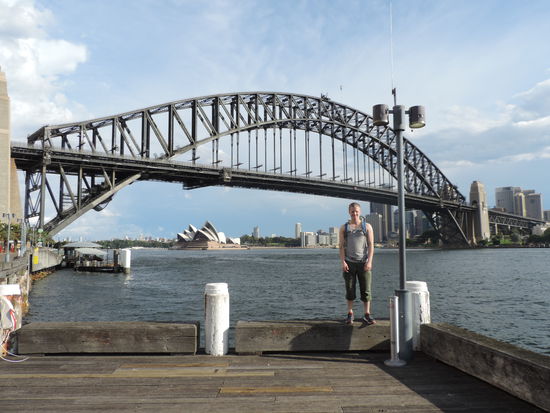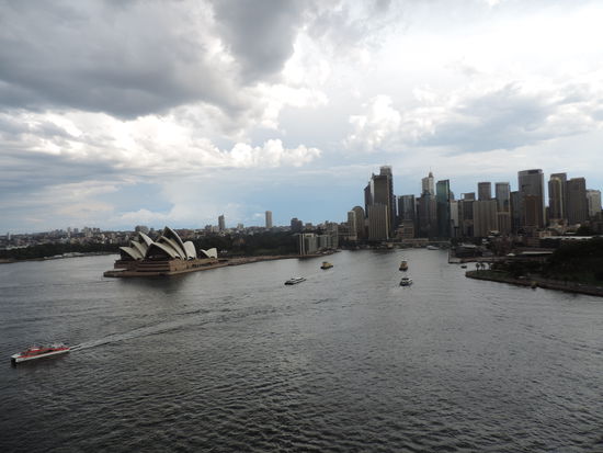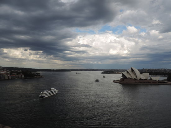 Danach machen wir uns auf den Weg zum Circular Quay. Vielleicht fahren wir ja noch mit dem Boot nach Manly? Aber als wir dort ankommen, regnet es plötzlich wieder aus Kübeln. Also wenn dann ja richtig! Wir setzen uns zu Mces und klauen Wifi bis es aufhört zu regnen, aber an den Strand möchte ich jetzt nicht mehr. Oli schlägt vor, doch einfach mal über die Harbour Bridge zu laufen. Also gesagt getan... durch das Viertel 'The Rocks' gelangen wir auf den Fußweg rechts entlang der Brücke. Der linke Weg ist für Radfahrer reserviert. Außerdem hat auch noch eine Straßenbahn und eine 5-spurige Schnellstraße Platz. Schon bombastisch dieses Bauwerk! Wir laufen auf die andere Seite des Hafens und runter ans Wasser zum Luna Park. Der hat um 18 Uhr schon geschlossen, aber die Aussicht von hier ist der Wahnsinn! Seht selbst: