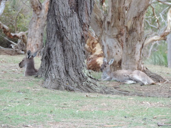 Heute morgen sind wir auf direktem Wege auf den Caravanplatz gefahren. Erstmal einen Kaffee getrunken und ausgiebig duschen gegangen. Dann haben wir angefangen mal das Auto auseinander zu nehmen, die dreckige Wäsche gesammelt und alles in die Waschmaschine gesteckt, dort die Steckdosen angezapft und abgewartet. Gegen mittag sind wir in den Deep Creek Conservation Park gefahren. Die "Straße" war aber so schlecht, dass wir bald wieder angehalten haben und zu Fuß weitegegangen sind. Unser Ziel war eigentlich der Blowhole Beach. Wir liefen eine Stunde über 4 Wheel Drive Gelände und hatten Aussicht auf Kangaroo Island, das Meer und Eukalyptusbäume. Je weiter wir liefen, desto öfter konnten wir zwischen den Bäumen Kangurus sehen. Die haben sich von uns garnicht stören lassen