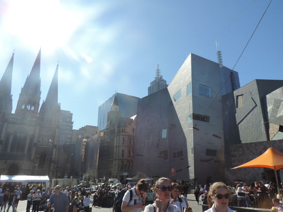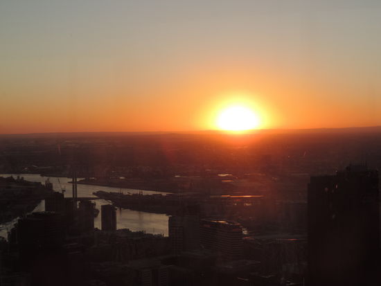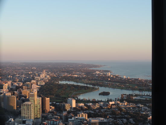 Gegen elf machten wir uns erstmal auf den Weg in die Stadt. Dort liefen wir einmal zu Fuß durch die Innenstadt, fuhren ein paar Stationen mit der kostenlosen Circle Tram und genossen danach ein ausgiebiges Abendessen auf einem Steg am Yarra River. Gegen 17 Uhr machten wir uns auf den Weg zum Eureka Tower, für den ich schon im Vorfeld Karten besorgt hatte. Mit dem schnellsten Aufzug der südlichen Hemisphäre wurden wir in ca. 40 Sekunden förmlich ins 88. Stockwerk geschossen. Von dort aus konnten wir, wieder bei bestem Wetter, einen super grandiosen Ausblick über Melbourne bewundern. Wir warteten auch den Sonnenuntergang ab und konnten so Melbourne auch bei Nacht erleben.